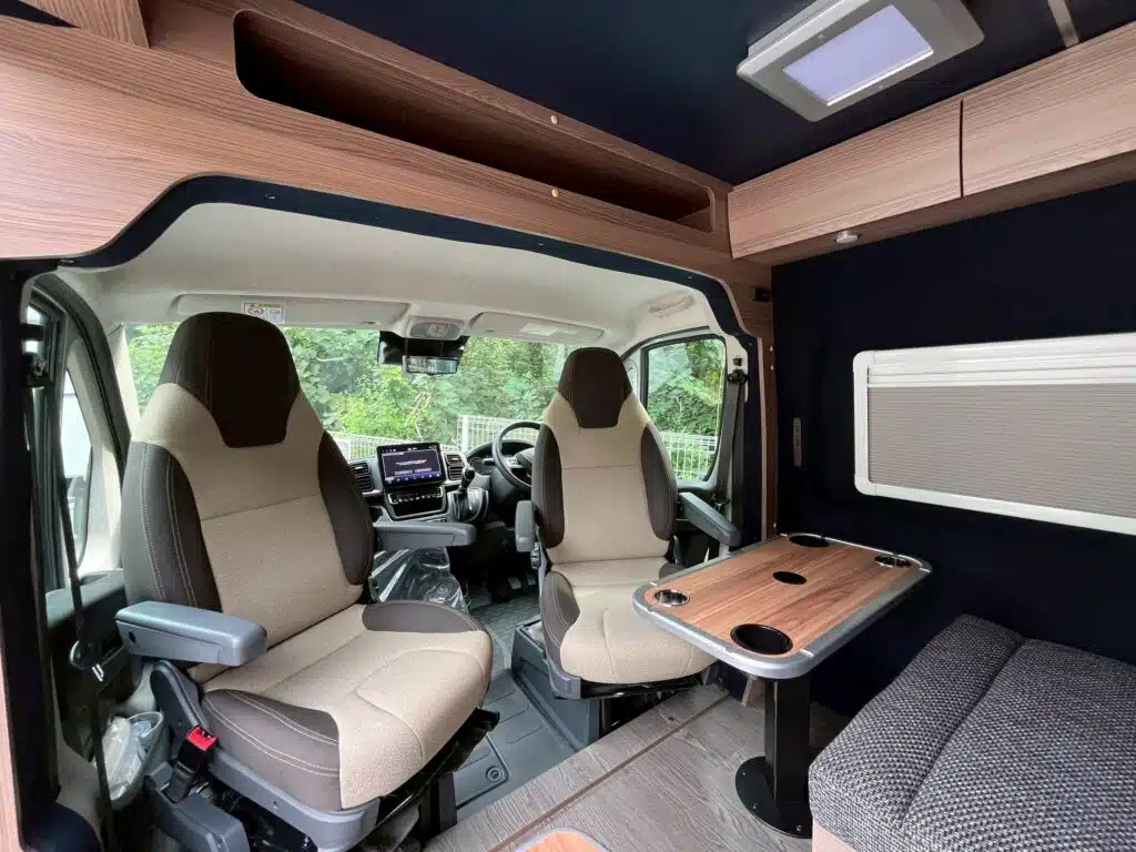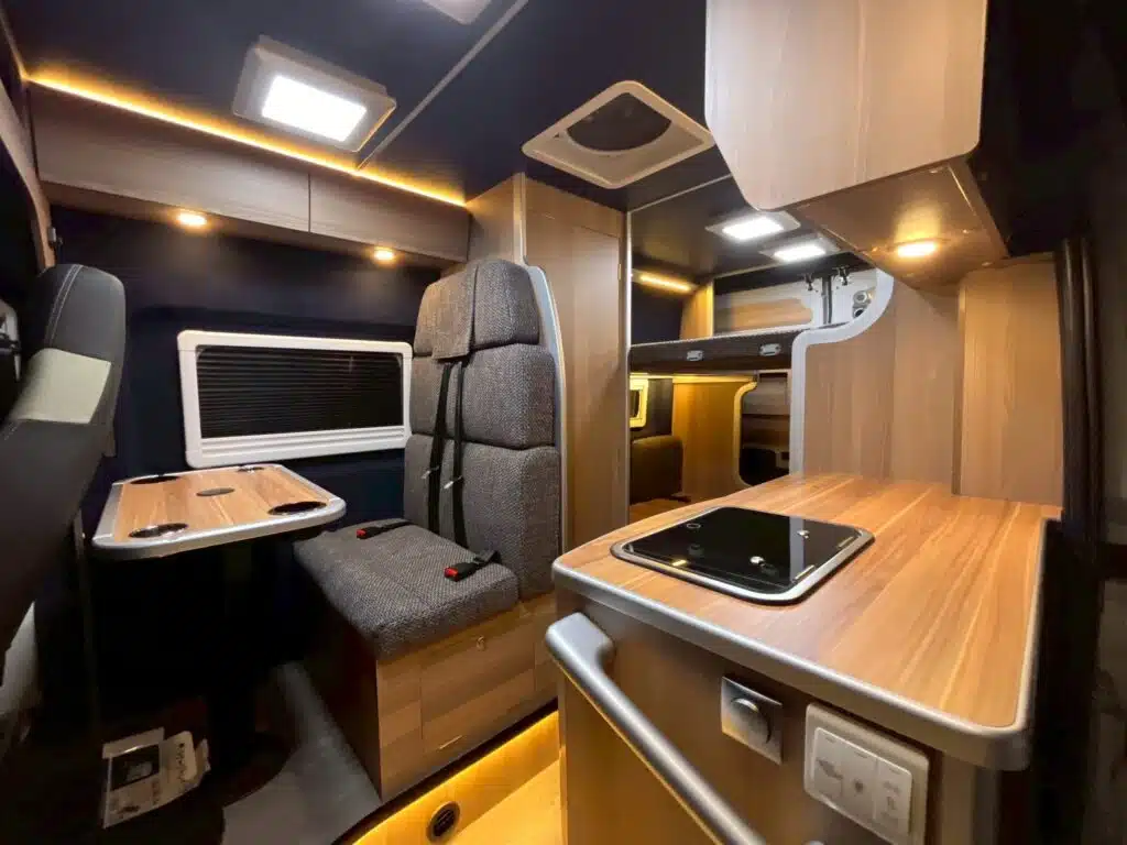 車内でマッサージができる車両として製作。リアは常設の2段ベッドにすることで、手早い施術へ移れるようインテリアを構想しました。
