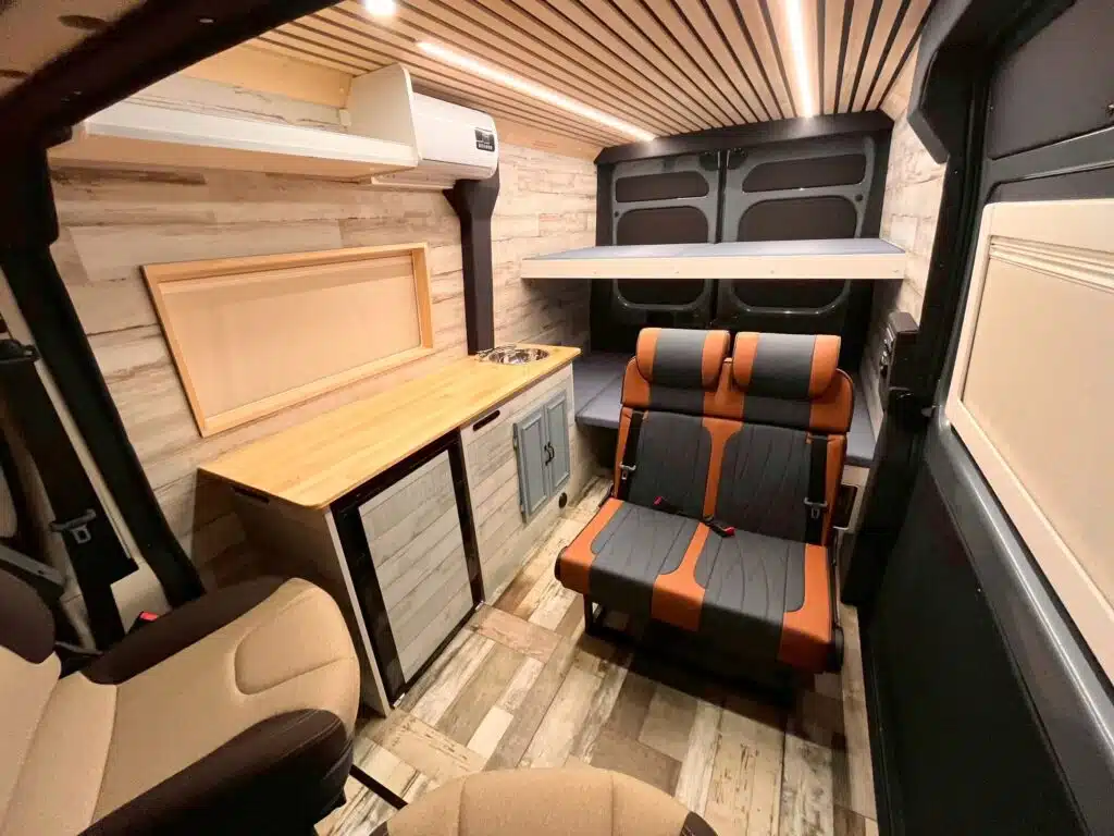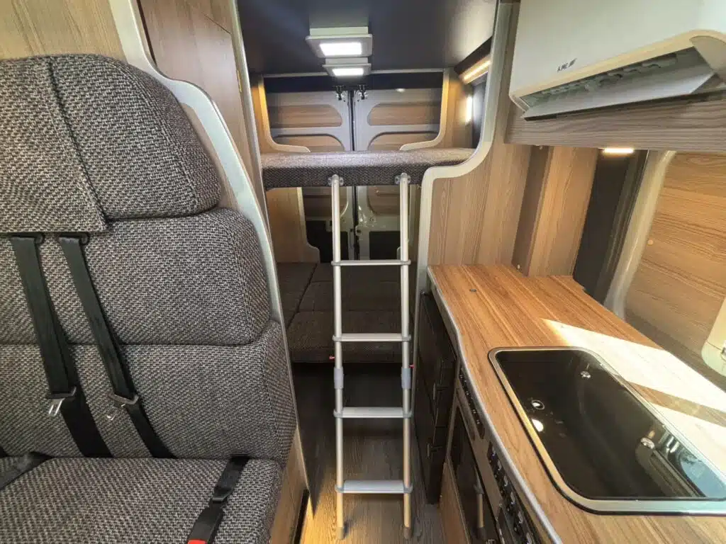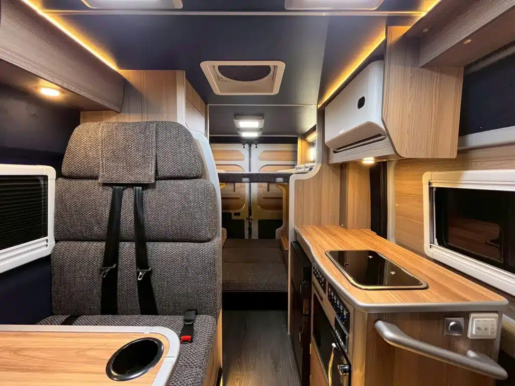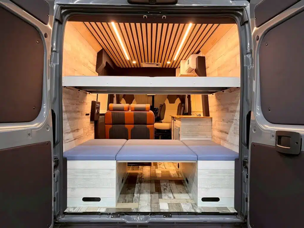 車内でマッサージができる車両として製作。リアは常設の2段ベッドにすることで、手早い施術へ移れるようインテリアを構想しました。